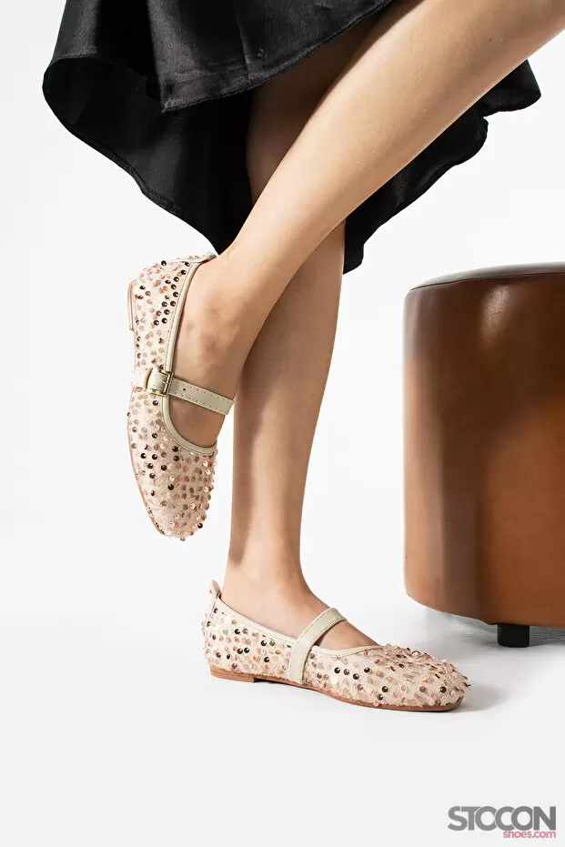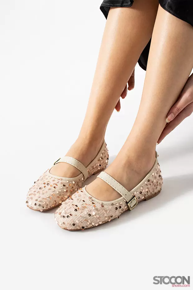STOCON Simli Bej Pullu Mary Jane Babet Şık Tokalı Ortopedik Taban Günlük Ayakkabı
